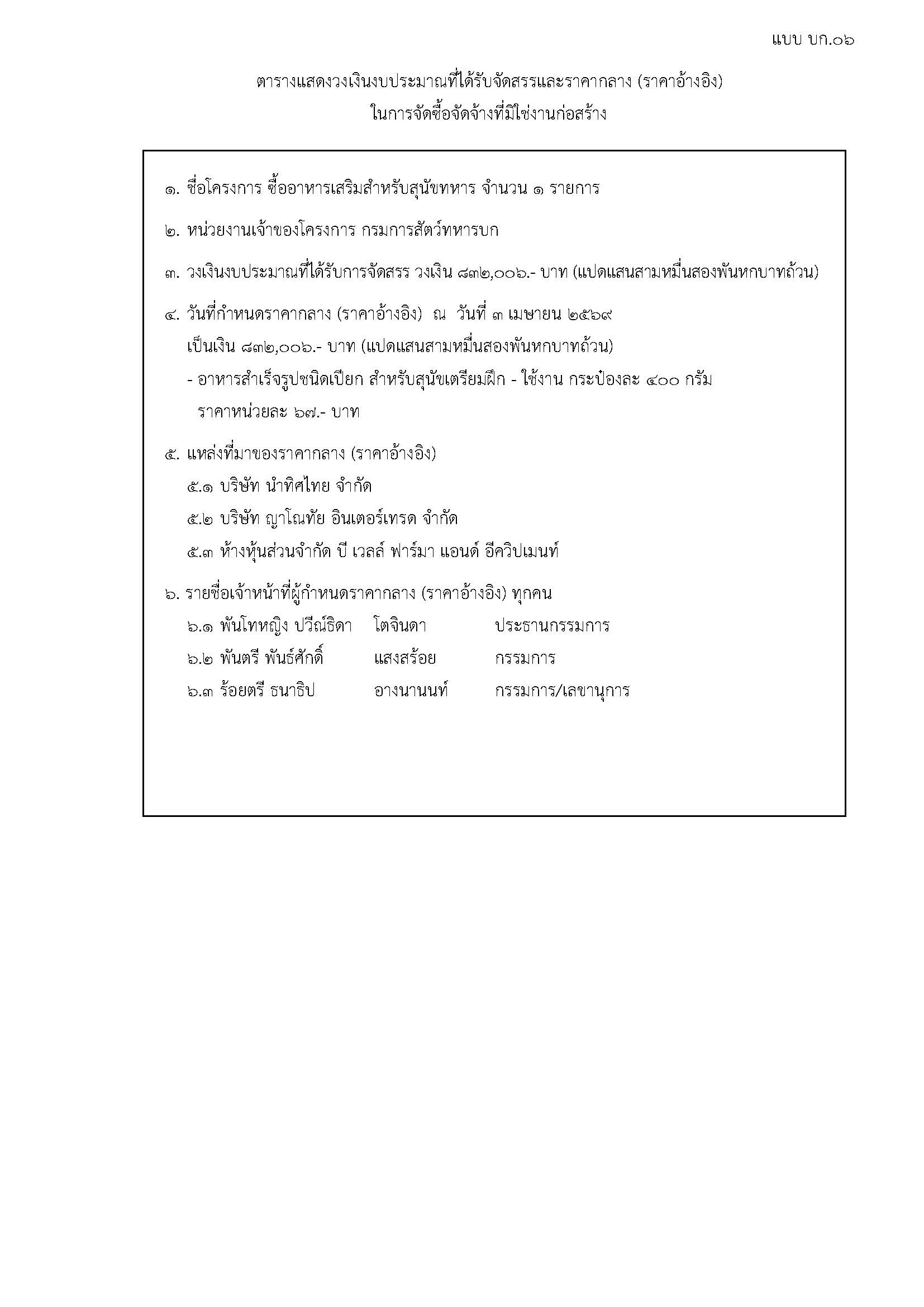ราคากลางโครงการซื้ออาหารเสริมสำหรับสุนัขทหาร จำนวน ๑ รายการ