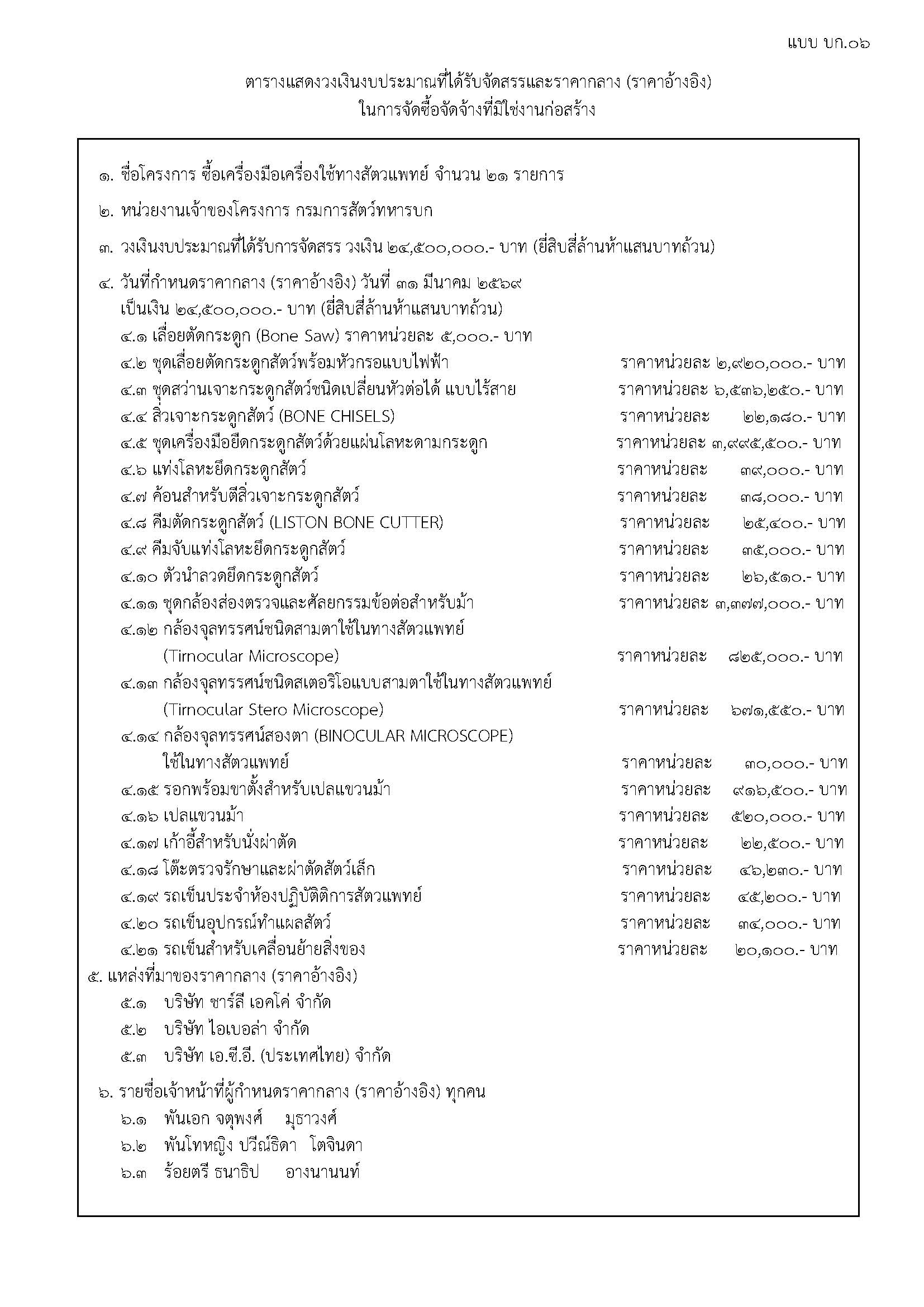 ราคากลางโครงการซื้อเครืองมือใช้ทางสัตวแพทย์ จำนวน ๒๑ รายการ