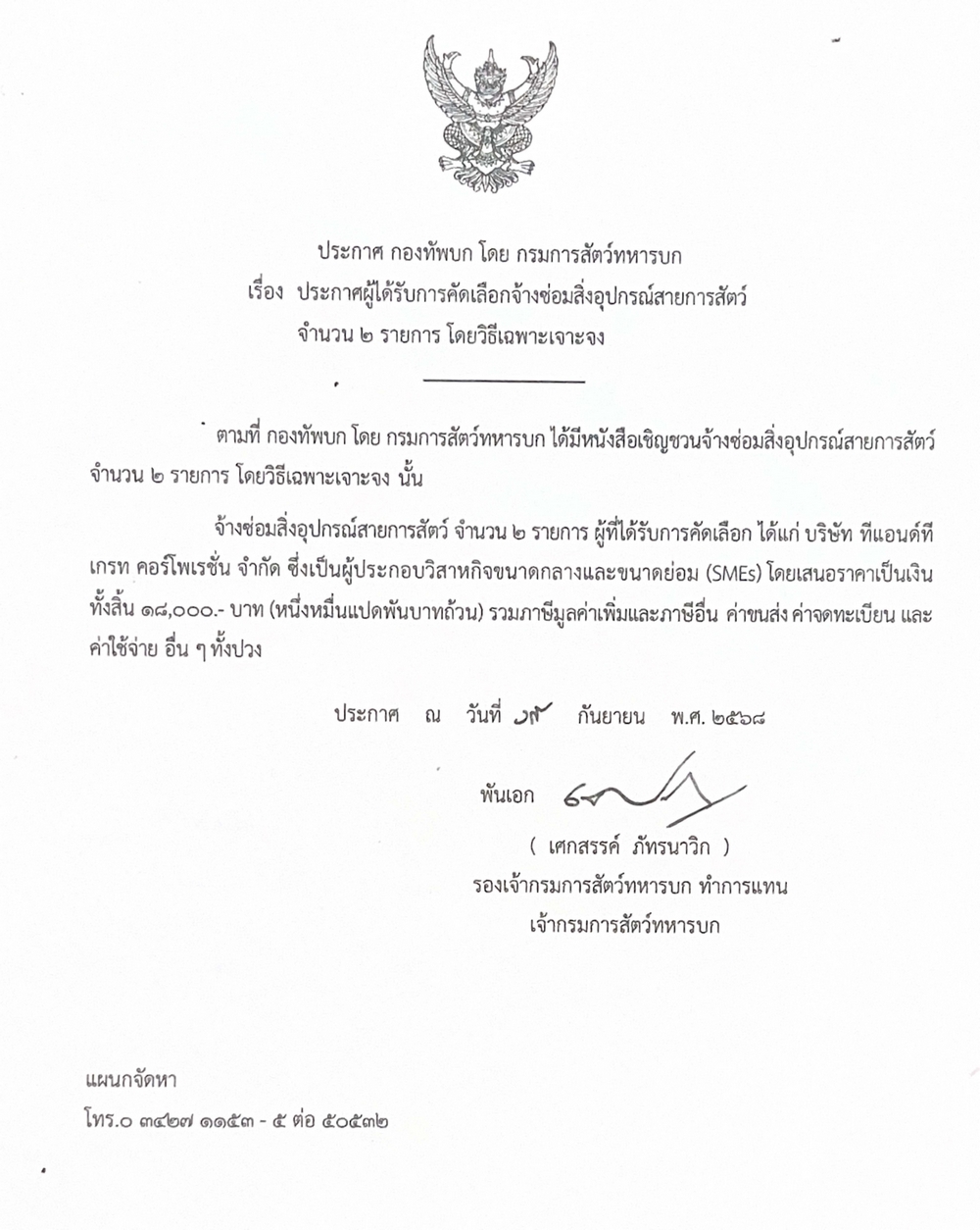 ประกาศผู้ได้รับการคัดเลือกจ้างซ่อม สป.สาย กส. จำนวน ๒ รายการ