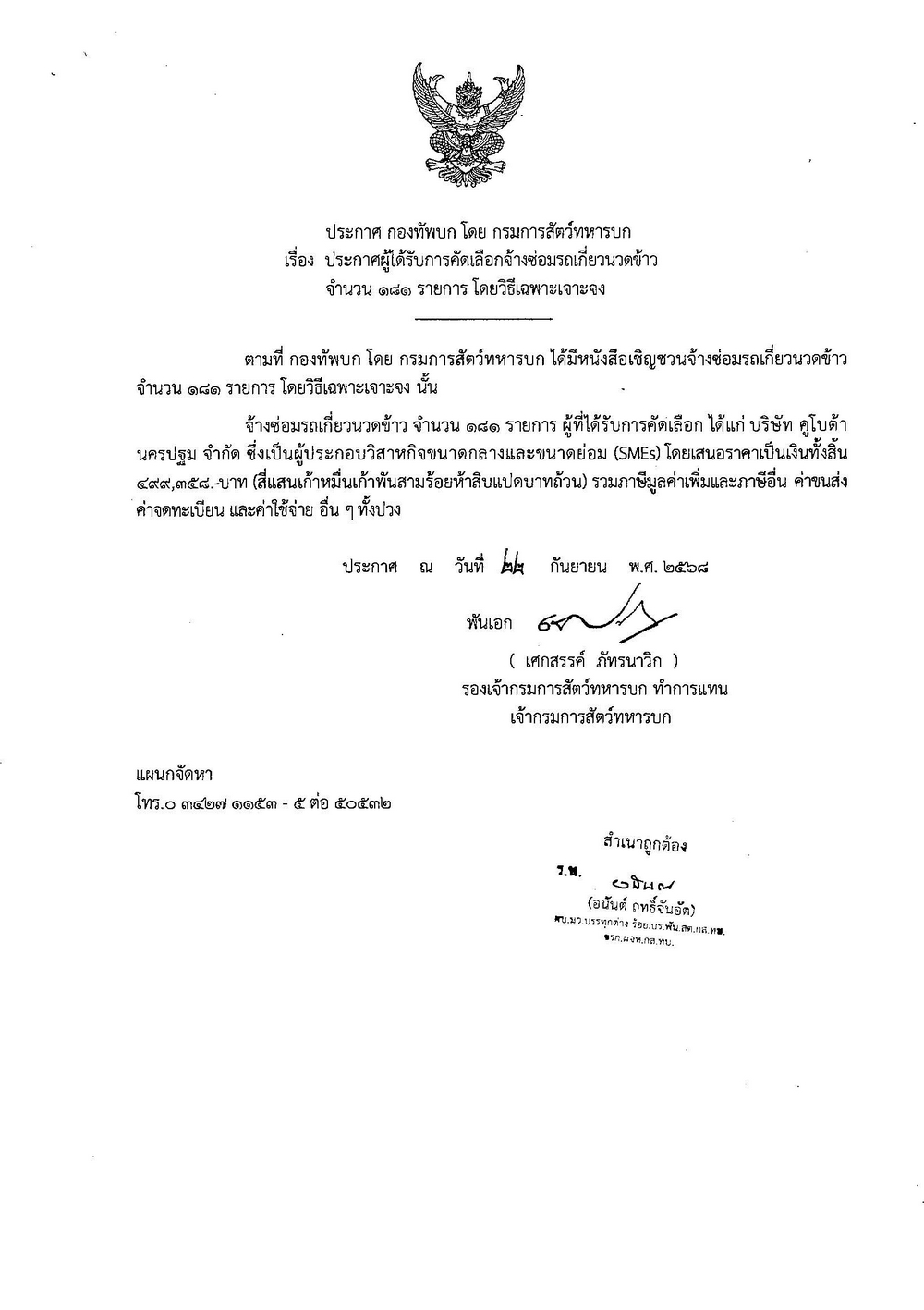ประกาศผู้ได้รับการคัดเลือกจ้างซ่อมรถเกี่ยวนวดข้าว จำนวน ๑๘๑ รายการ