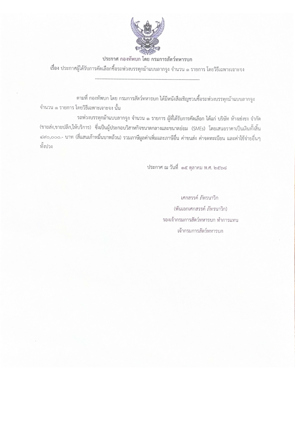 ประกาศผู้ได้รับการคัดเลือกซื้อรถพ่วงบรรทุกม้าแบบลากจูง