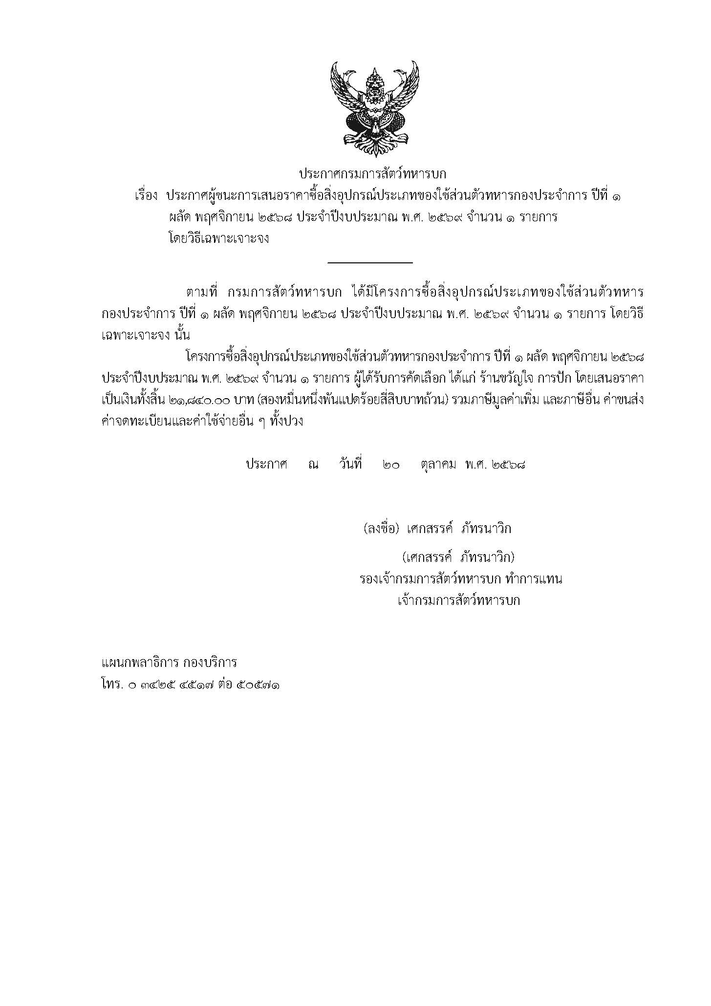 ประกาศผู้ชนะการเสนอราคาซื้อ สป.ประเภทของใช้ส่วนตัวทหารกองประจำการปีที่ 1 ฯ