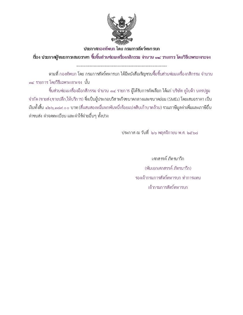 ประกาศผู้ชนะการเสนอราคาซื้อ สป.ชิ้นส่วนซ่อมเครื่องมือกสิกรรม จำนวน ๓๔ รายการ