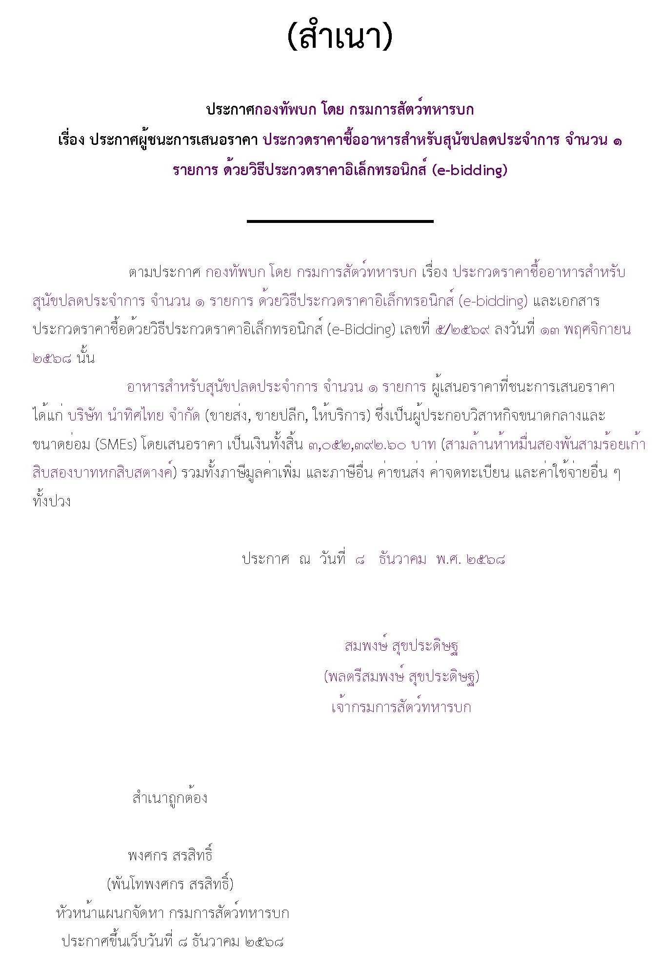 ประกาศผู้ชนะการเสนอราคา ประกวดราคาซื้ออาหารสำหรับสุนัขปลดประจำการ จำนวน ๑ รายการ