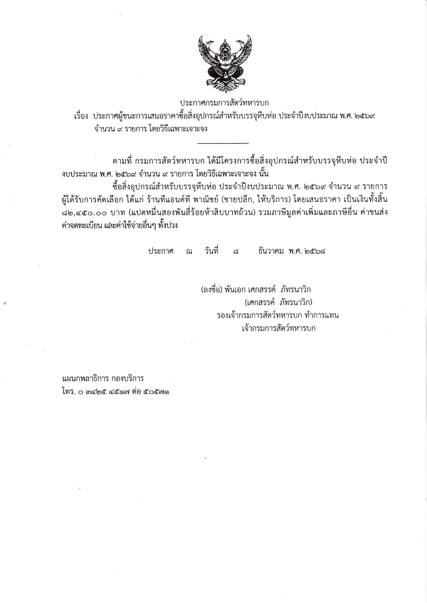 ประกาศผู้ชนะการเสนอราคาซื้อ สป.สำหรับการบรรจุหีบห่อ ประจำปีงบประมาณ ๒๕๖๙