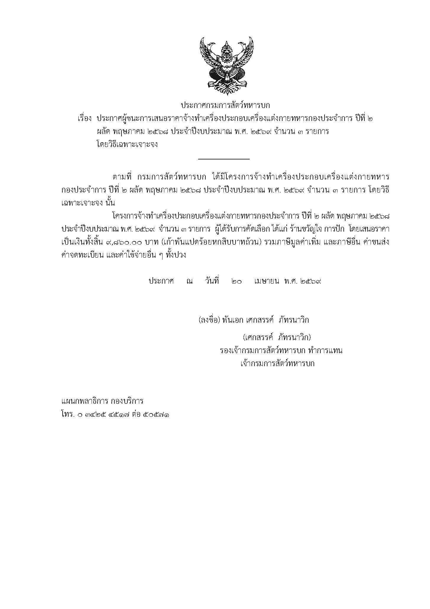 ประกาศผู้ชนะการเสนอราคาจ้างทำเครื่องประกอบเครื่องแต่งกายทหารกองประจำการฯ