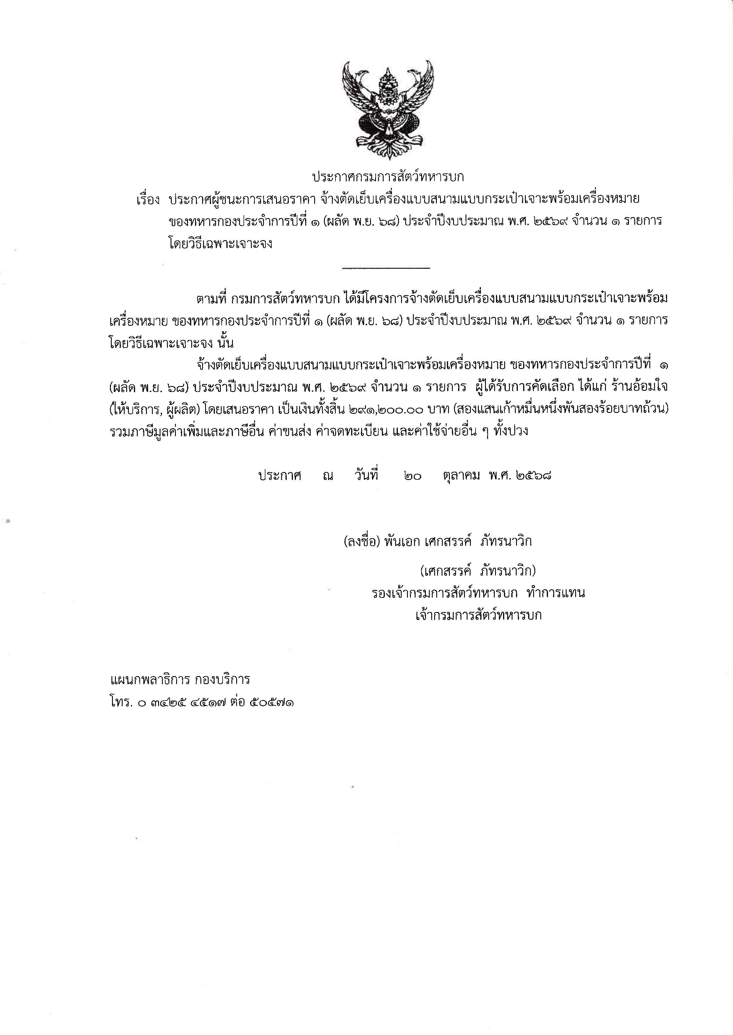 ประกาศผู้ชนะการเสนอราคาจ้างตัดเย็บเครื่องแบบสนามฯ