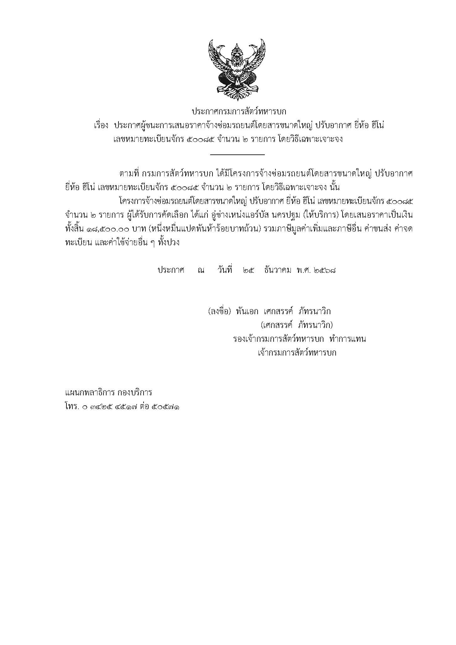 ประกาศผู้ชนะการเสนอราคาจ้างซ่อมรถยนต์โดยสารขนาดใหญ่ ปรับอากาศ ยี่ห้อ ฮีโน่ 50085