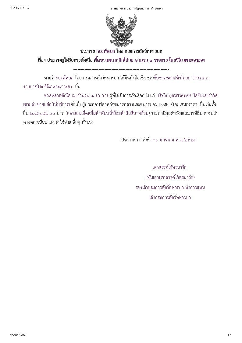 ประกาศผู้ได้รับการคัดเลือกซื้อขวดพลาสติกใส่นม จำนวน ๑ รายการ