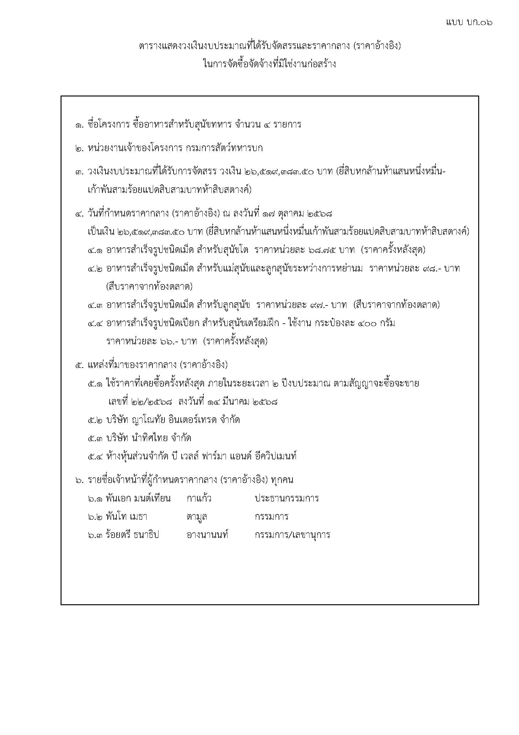 ราคากลางโครงการซื้ออาหารสำหรับสุนัขทหาร จำนวน ๔ รายการ
