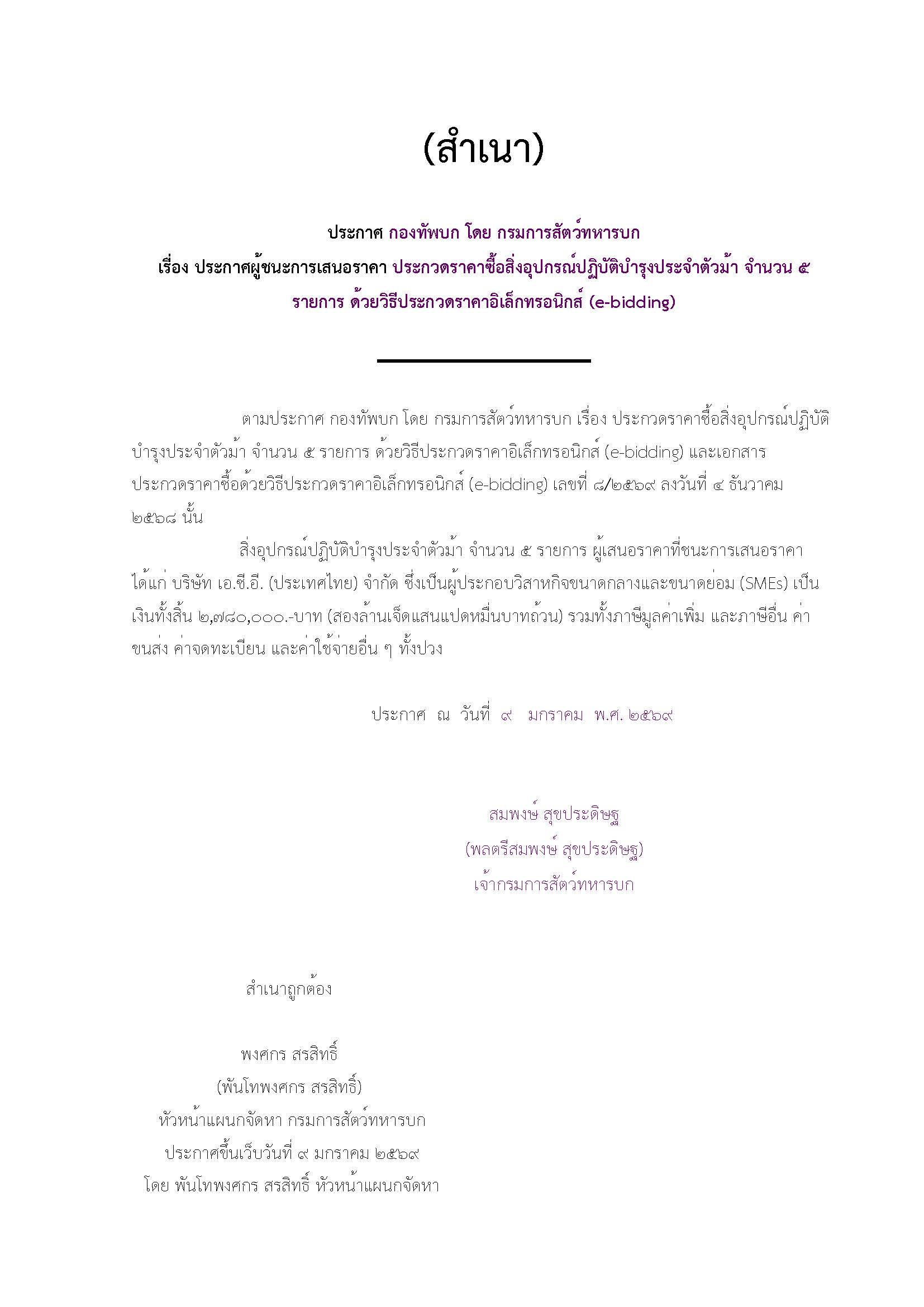 ประกาศผู้ชนะการเสนอราคา ประกวดราคาซืือ สป.ปฏิบัติบำรุงประจำตัวม้า จำนวน ๕ รายการ