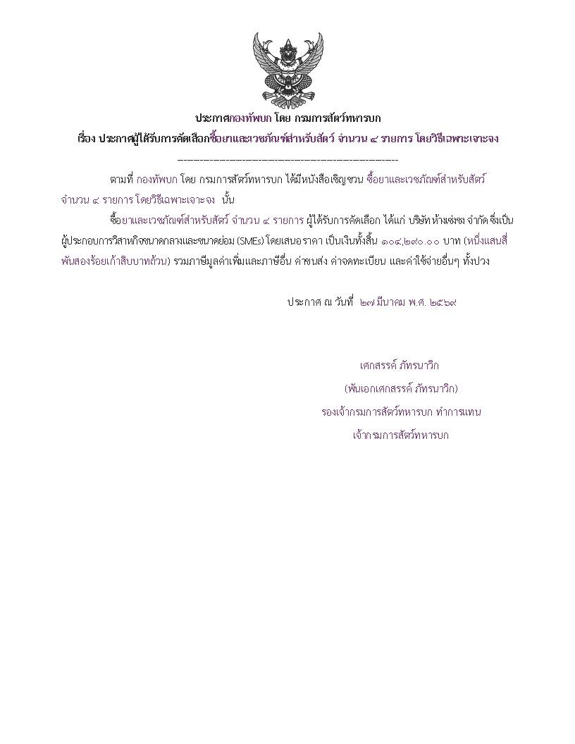 ประกาศผู้ได้รับการคัดเลือกซื้อยาและเวชภัณฑ์ สำหรับสัตว์ จำนวน ๔ รายการ โดยวิธีเฉพาะเจาะจง