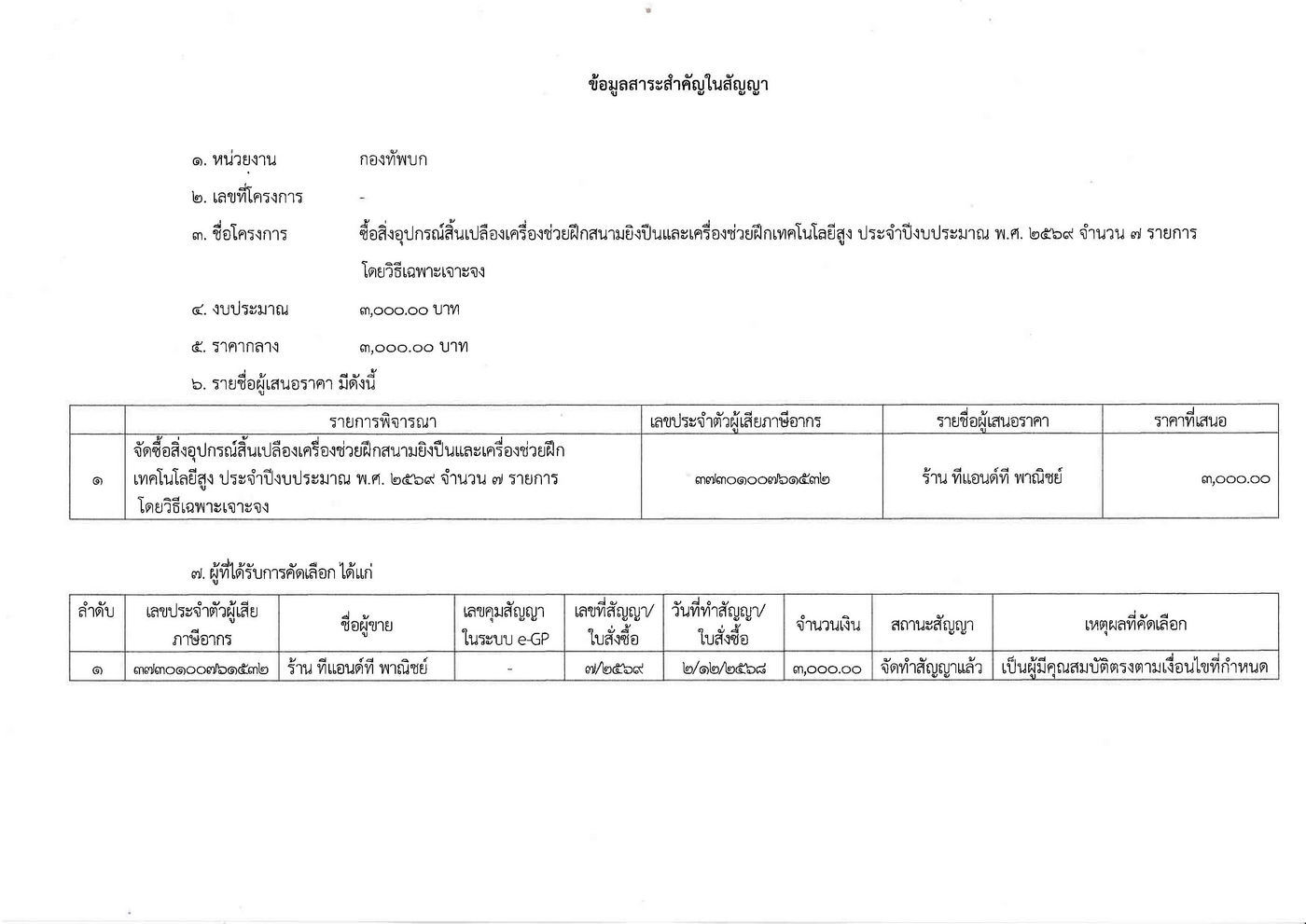 ข้อมูลสาระสำคัญในสัญญา โครงการซื้อ สป.สิ้นเปลืองเครื่องช่วยฝึกฯ