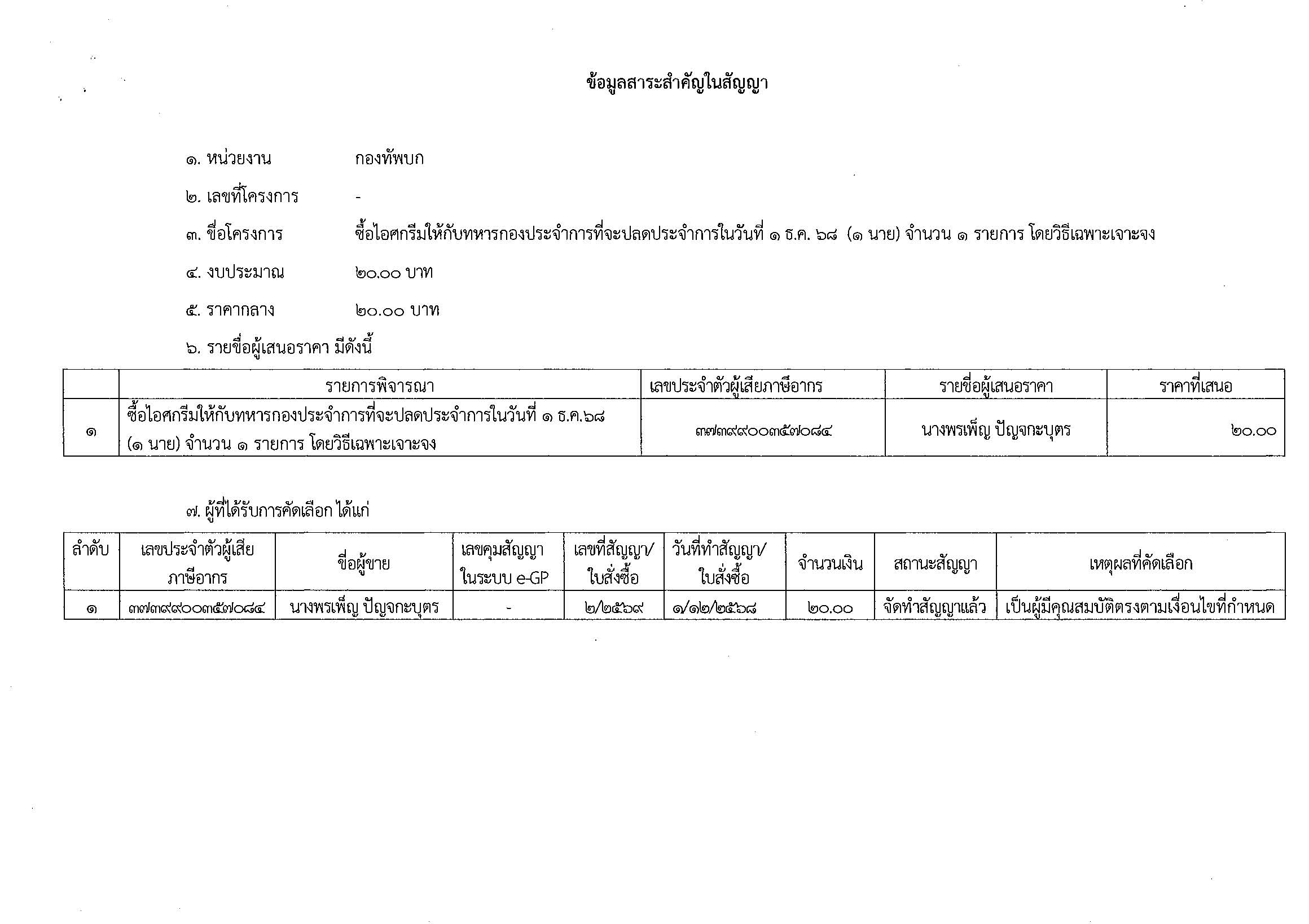 ข้อมูลสาระสำคัญในสัญญา โครงการซื้อไอศกรีมให้กับทหารกองประจำการฯ