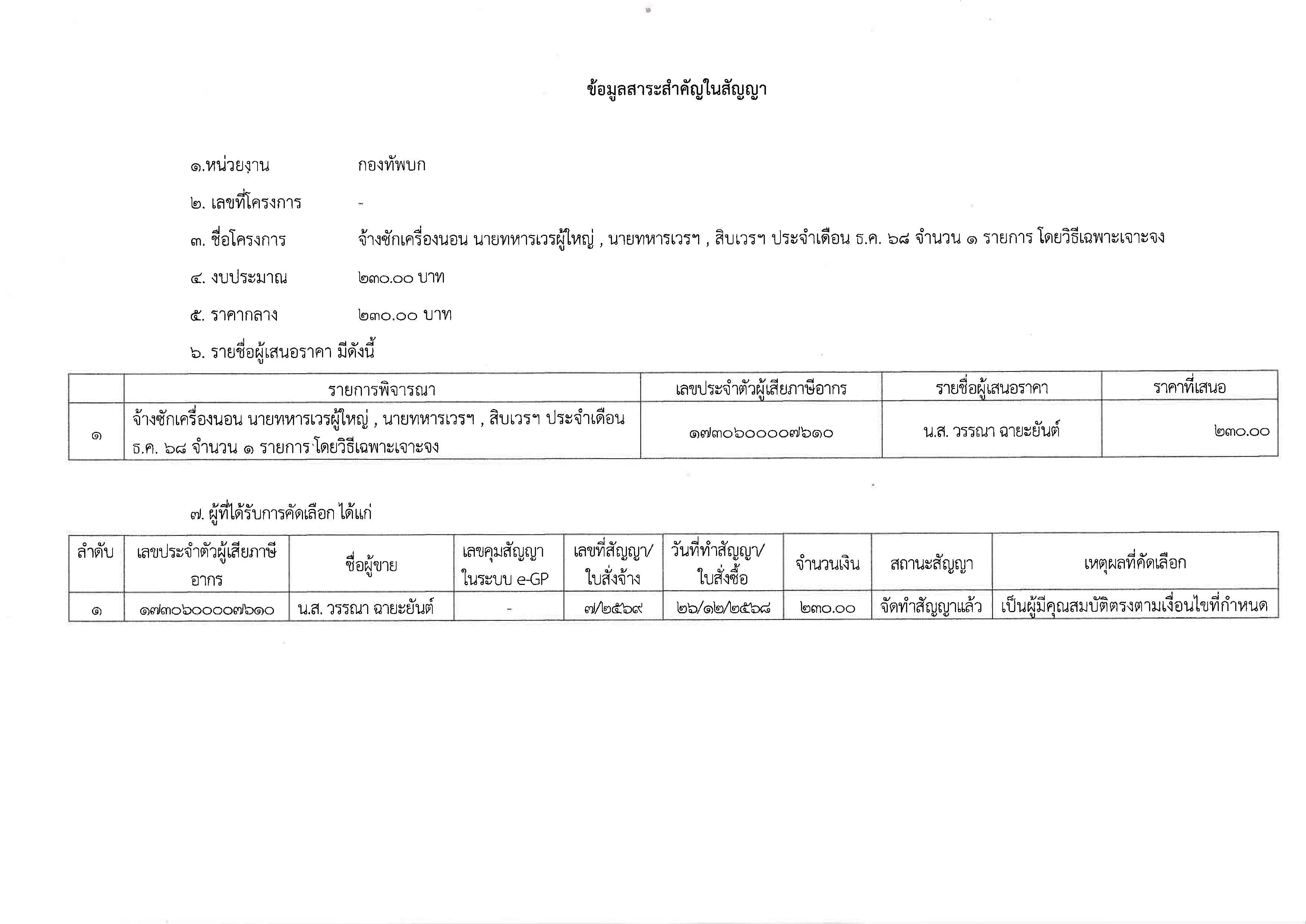 ข้อมูลสาระสำคัญในสัญญา โครงการจ้างซักเครื่องนอน นายทหารเวรผู้ใหญ่ ฯ ประจำเดือน ธ.ค.๖๘