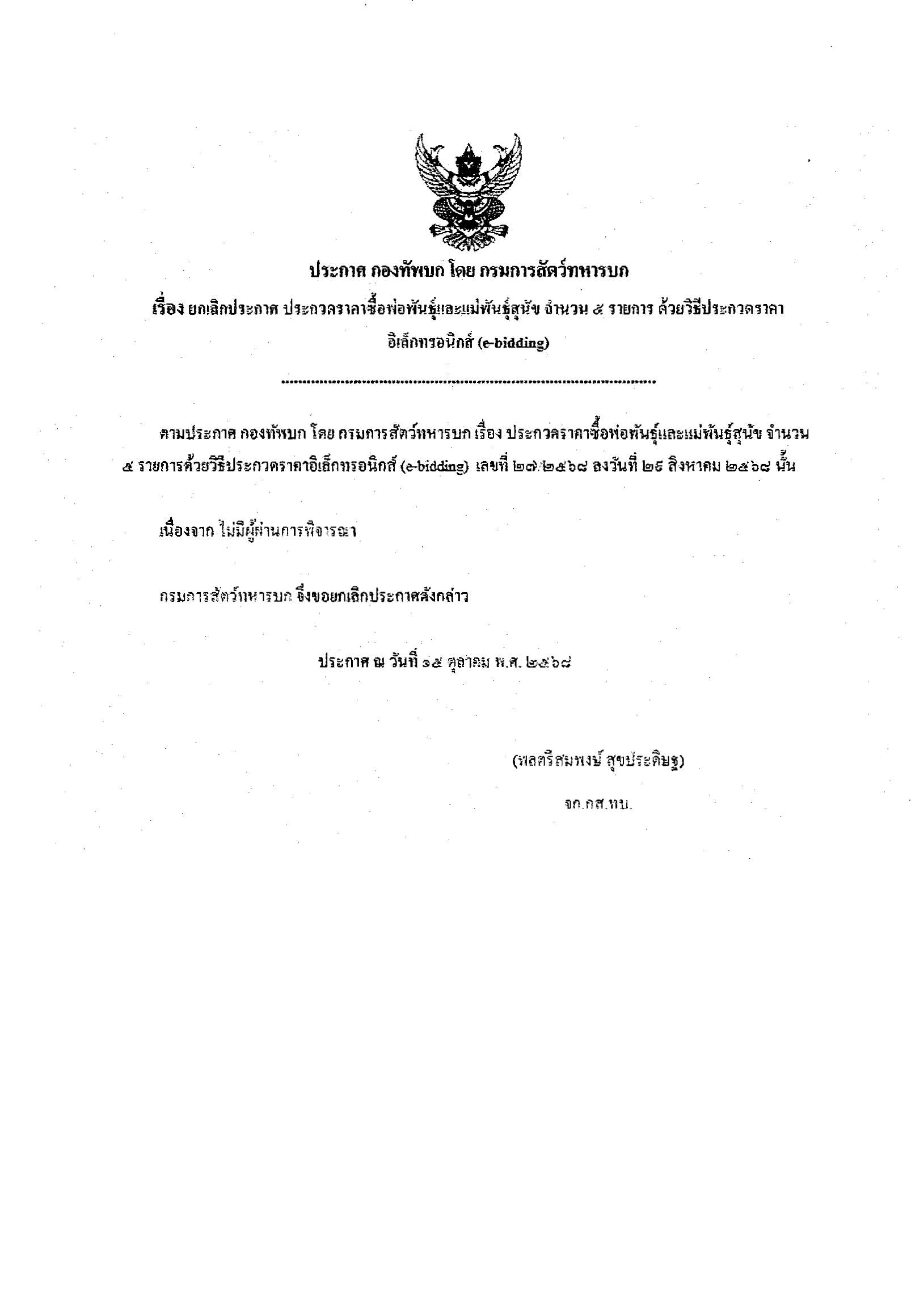 ยกเลิกประกาศ ประกวดราคาซื้อพ่อพันธุ์และแม่พันธุ์สุนัข ฯ