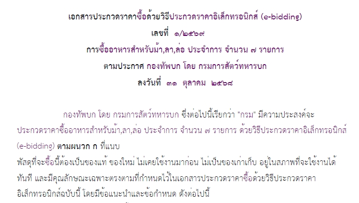 ประกวดราคาซื้ออาหารสำหรับ ม้า ลา ล่อ ประจำการ จำนวน ๗ รายการ